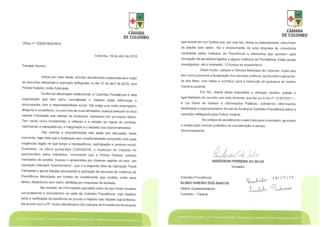 Vereador Anderson Prego Solicita informações na Colombo Previdência